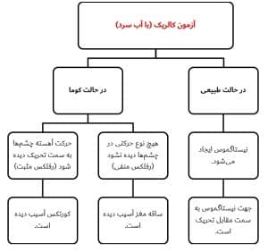 رفلکس اکولووستیبولار یا آزمون کالریک یعنی چه؟ در افراد طبیعی، اگر مجرای خارجی یک گوش با آب (سرد یا گرم) تحریک شود، نیستاگموس بوجود میآید. اگر آب سرد وارد مجرای گوش شود، جهت نیستاگموس به سمت مقابل تحریک است. اگر بیمار در وضعیت کوما باشد و مجرای خارجی یک گوش او را با آب سرد تحریک کنیم. دو حالت وجود دارد: الف) هیچ حرکتی در چشمها دیده نمیشود: یعنی رفلکس منفی است. به عبارت دیگر ساقه مغز آسیب دیده است. ب) چشمها به سمت گوش تحریک شده حرکت میکنند: یعنی رفلکس مثبت است. در این حالت ساقه مغز سالم است. در صورت استفاده از آب گرم، جهت حرکت چشمها (و نیستاگموس) برعکس موارد فوق خواهد بود. در الگوریتم زیر مطلب زیر را بخوانید: