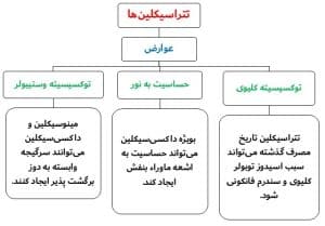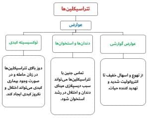 تتراسیکلینها میتوانند سبب اختلالات گوارشی، کبدی، کلیوی، توکسیسیته وستیبولر و حساسیت به نور شوند.