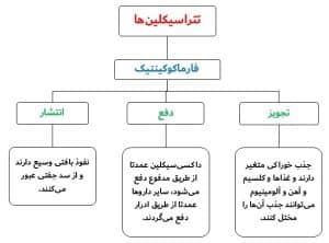 تتراسیکلینها آنتیبیوتیکهای باکتریواستاتیک و وسیع الطیف هستند که سنتز پروتئین را در باکتریها مختل میکنند:
