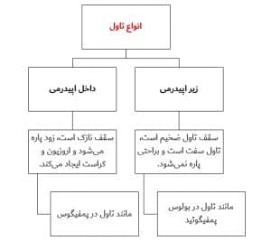 تاولهای پوستی را به دو دسته اصلی تقسیم میکنیم: داخل اپیدرمی و زیر اپیدرمی. این دو نوع تاول با هم تفاوتهایی دارند: