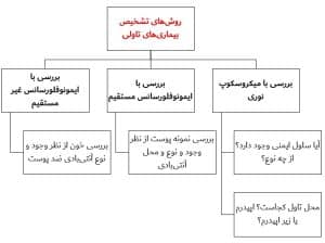 برای تشخیص بیماریهای تاولی اتوایمیون پوست از روشهای مختلفی استفاده میشود: معمولا نمونه برداری انجام شده و با میکروسکوپ ایمونوفلورسانس و میکروسکوپ نوری بررسی انجام میشود: