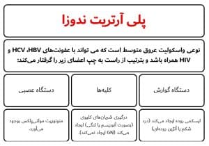 پلی‌آرتریت ندوزا از جمله واسکولیت‌های عروق متوسط است که می‌تواند اعضای مختلفی را گرفتار کند و تظاهرات بالینی اصلی آن به شرح زیر هستند: